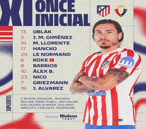 雷速体育10月19日报道宣称 西甲第9轮马竞vs奥萨苏纳,赛前两队公布首发。