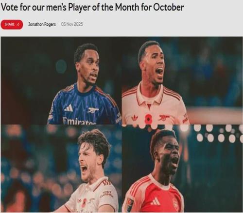 官方:阿森纳宣布廷贝尔、加布里埃尔、赖斯和萨卡被提名为了队内10月份最佳球员候选。
