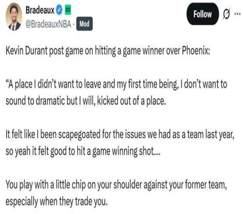 对于杜兰特来说,用一记三分绝杀手刃旧主,也让他一扫憋在胸中已久的闷气,赛后一番话扎心老东家太阳。