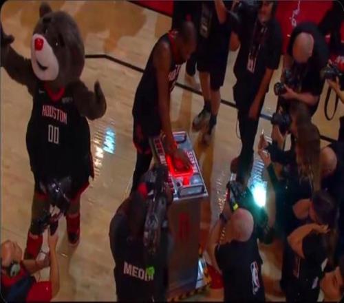 在吐槽完老东家后,杜兰特也表达了对于新东家火箭队的满意,后者也在赛后安排杜兰特按下“引擎”触发“火箭升空”特效来庆祝球队拿下胜利。