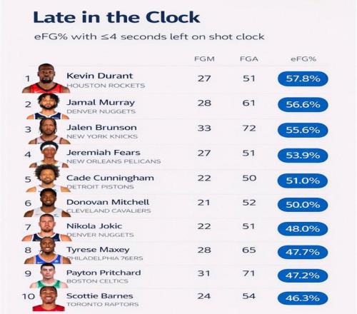 本赛季至今,在进攻时间最后4秒以内的有效投篮命中率方面,37岁的杜兰特依旧笑傲整个NBA,命中率高达57.8%。