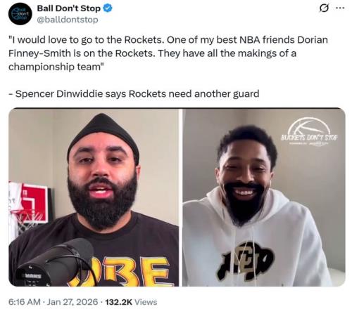 丁威迪在节目中说道:“我真的非常想要加盟火箭,我最好朋友之一的芬尼史密斯他在那里,同时我认为他们具备争冠能力,并且的确缺少一名控卫。”